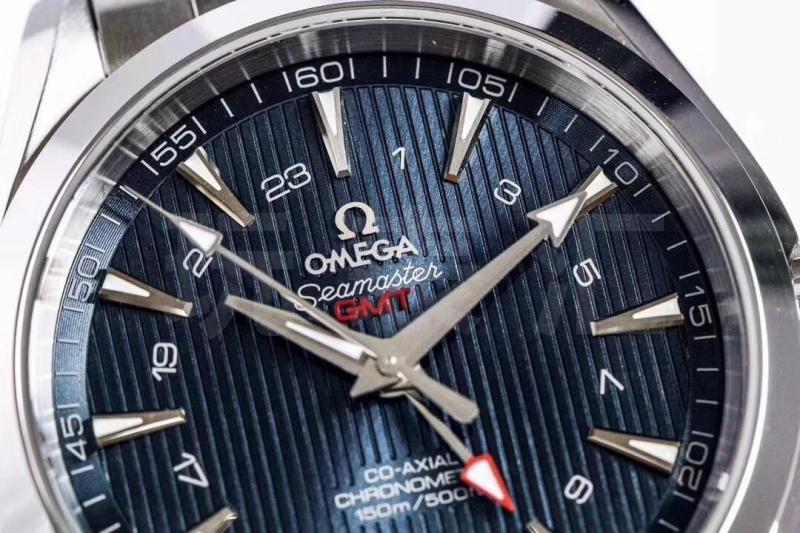 VS厂欧米茄海马系列150米GMT「格林威治时间」腕表 直接为43MM厚度为13MM,采用316精钢制作表壳在加以抛光拉丝的工艺处理,外观质感是很不错的。蓝色的竖向垂直条纹的字面带有淡淡的放射纹效果,12点刻度下方并带有GMT的标识。12个金属条钉刻度都带有斜切纹的,并且后期做了很精细的打磨,刻度的反光很亮质感强烈。在刻度的粗一边进行切割开口,进行夜光粉填充,带红色的指针是GMT指针,内圈里一圈数字是GMT指针的刻度。