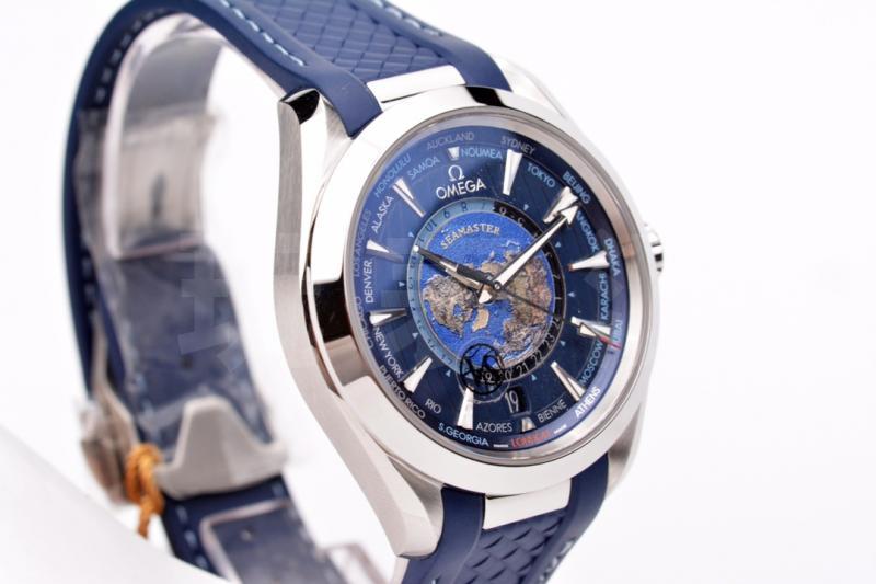 表盘采用多层结构,其中心是世界地图浮雕(显然要想批量卖,微绘珐琅地图太贵了),该浮雕是在5级钛金属板上制成的,采用激光烧蚀将蓝色的海洋和各大洲隔离开来。地图外圈是24小时 hesalite硬质玻璃环,分别以浅蓝色和深色蓝色显示白天和黑夜。表盘外圈是蓝色垂直条纹,模仿游艇上的柚木甲板,这一直是Aqua Terra系列的标志性设计元素。最后,在表盘的最外部,分别印制了世界主要城市---白色字体城市为应用夏令时的地点,蓝色字体城市为常规地点,虽然巴黎或日内瓦通常用来表示格林尼治标准时间+1的时区,但在这里已被瑞士欧米茄(Omega)所在地的比尔(Bienne)取代。。除具有世界时间功能外,表盘的其余部分是熟悉的AT元素,比如带有锐利的三角形斜度填充式时标。