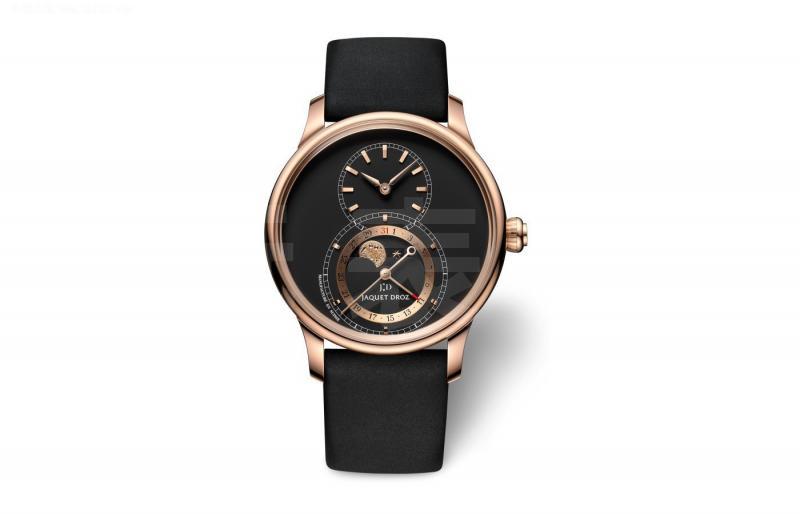 腕表点评:最后我们来以一款雅克德罗收尾,图上这款也是品牌纪念皮埃尔·雅克德罗诞辰300周年所推出的全新月相大秒针腕表,比起之前的43毫米和39毫米,品牌也是首次推出41毫米这种适中尺寸,厚12.90毫米。18K红金表壳经过抛光处理后,也会显得更加温润。黑色哑光盘面搭配标志性的8字形显示盘布局,上半部分为时分显示盘,雅克德罗也是首次采用红金条状时标,下部分则为大秒针以及日期轮盘,并中置月相显示。红金、暗黑两种色调再结合金质月相,盘面光辉与深邃感相得益彰。表款搭载一枚Jaquet Droz 2660QL4自动上链机械机芯,装配硅质摆轮游丝及擒纵叉,双发条盒,18K红金摆陀,上满链后可提供68小时动储,整表防水30米。随表配有卷边手工黑色小牛皮表带。