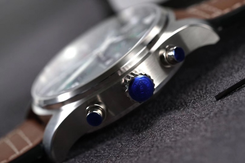腕表的所有刻度包括指针都有金属包边,夜光填充均匀,没有外溢或者凹凸不平的现象出现。分针和计时秒针末端并不是笔直的,而是弯曲下沉的,所有高仿万国飞行员系列腕表共同的特点,在这一点上ZF完美的还原了这个细节。