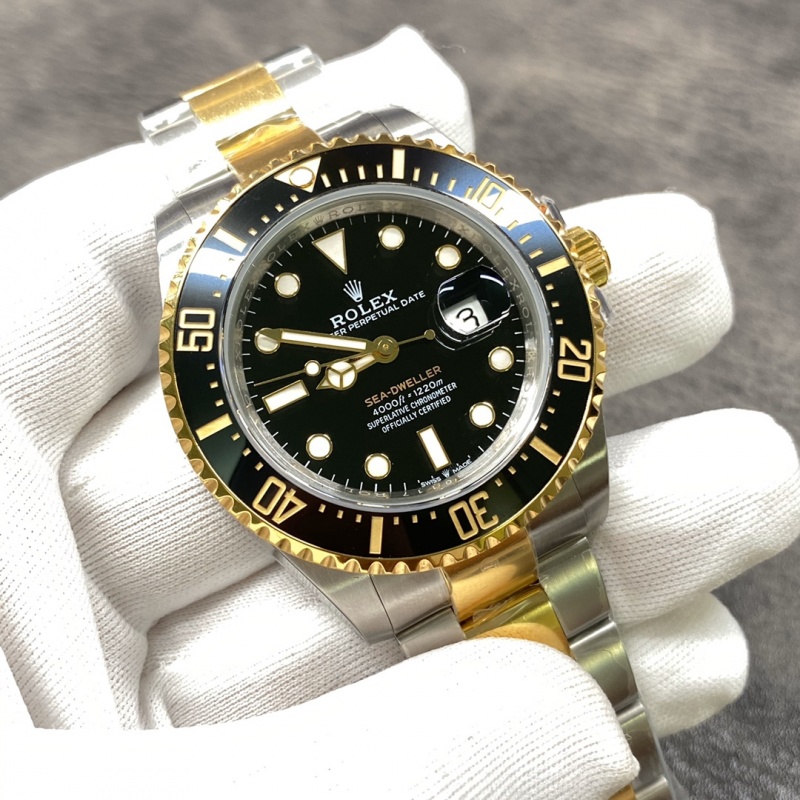 大家好,我是万表汇的小编。今天我主要要开箱一支近期为原价购买的全新的劳力士表。这只腕表呢马上成为了我目前收藏里面我最喜欢的一只腕表,但是在购买这只腕表之前呢,其实我从来没有想过在今后的某一天,我会购买这只腕表。那么这只腕表就是Sea-dweller 开始系列里面的一只腕表。那么我自己呢其实一直都非常喜欢劳力士的Sea-dweller。那么为什么我之前一直没有想过我会购买这样一支Sea-dweller呢?基本上有两个原因。第一个原因呢是这只腕表的价钱,这只腕表呢是劳力士里面最贵的一只海使。另外一个原因呢是这只腕表呢是一个间金的款式。其实我在两三年前呢,基本上从来不会考虑劳力士间金的款式。但近两年呢我慢慢的喜欢上了劳力士的间金的表款。比方说劳力士GMT root beer,还有劳力士水鬼蓝盘的间金的表款,另外呢就是今天我要开箱的这只间金的海使,有些网友把它叫做金刚海使,
