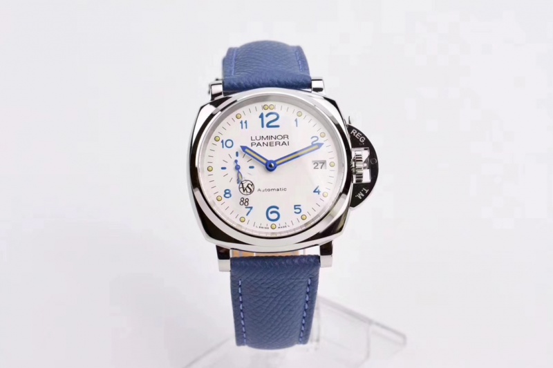 沛纳海PAM 906 面盘独特乳白象牙磨砂,彰显腕上柔情,蓝色大数字,清晰鲜明。海蓝色主调给人焕然一新,如果您既要沛纳海海硬朗大气,又要儒雅大方,PAM906再合适不过。