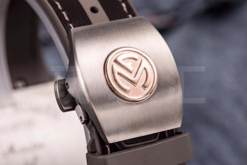 氟橡胶+小牛皮表带巧妙地融入钛金属表壳,氟橡胶具有很好的耐高温性能,耐油性能,耐腐蚀性能;很多表迷可能觉得全橡胶的可能好一些,这是一种误解,纯橡胶的太软,做表带不太好。钛金属表壳二次精密拉丝,中间镶嵌独立开模具只做的并镀金处理的品牌logo。